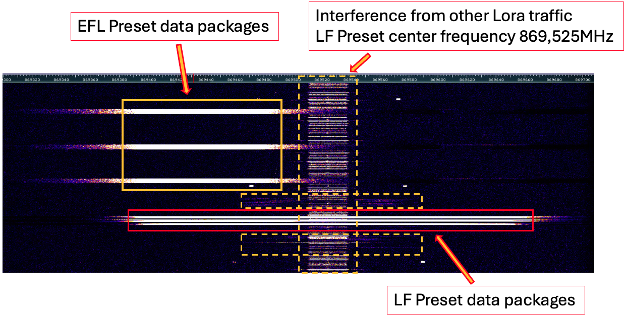 This image is a conceptual, illustrative visualization of how LF and EFL data packets may appear and relate to other LoRa traffic within the same frequency range. It is not a precise measurement or an exact representation of on-air behavior, but a simplified depiction intended to help explain relative bandwidth usage, packet placement, and potential interference between different presets. Actual signal characteristics may vary depending on configuration, environment, and network activity.