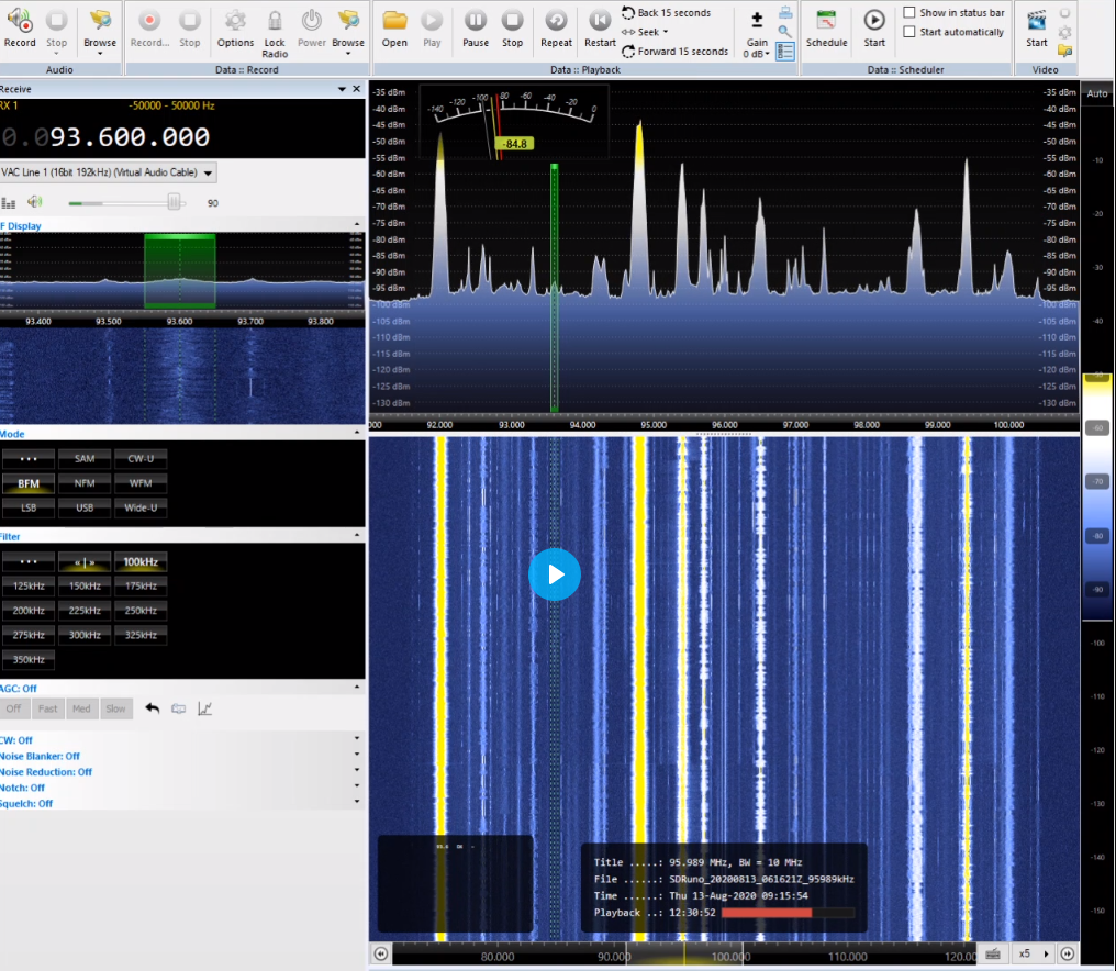 3-element FM Yagi antenna pointing 230 degrees from my KP01tn location (towards UK) and then just recording what ever comes. I selected center tuning of 96MHz as it has the most free around it at my location. Using SDRUno and 8MHz band I recorded whopping 4,5 Terabytes of data.