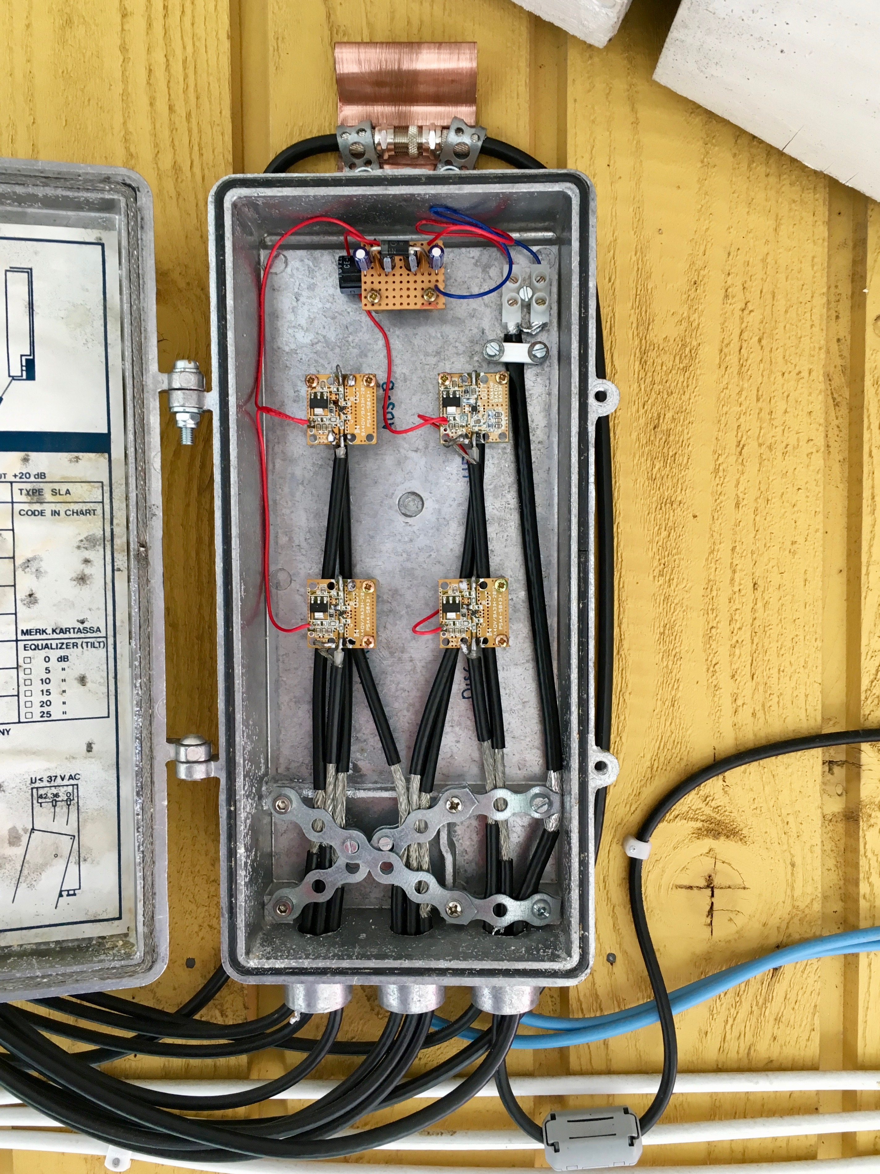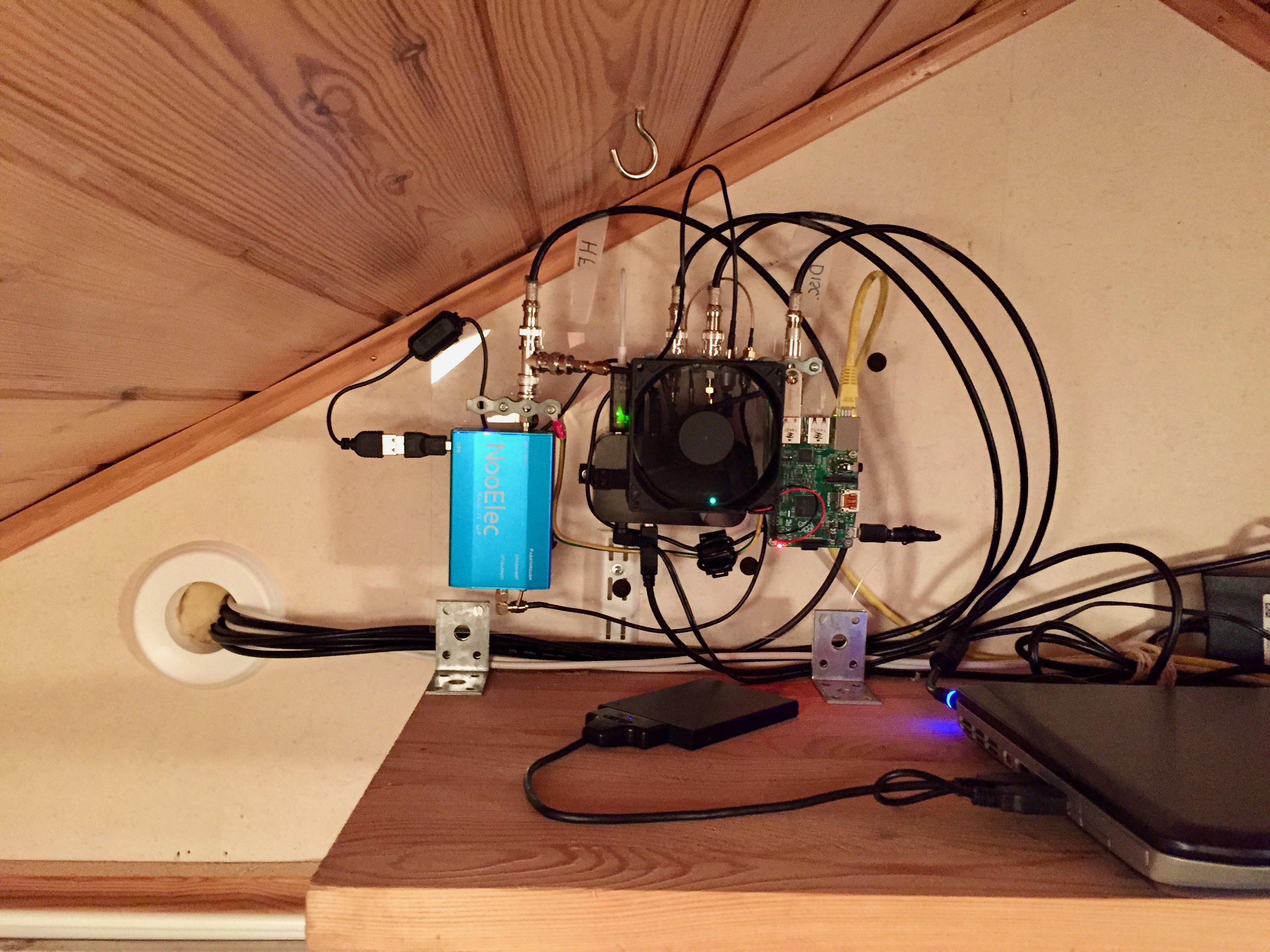 Antennas as described in the About page, RaspberryPi 2b ADS-B feeder to Flightradar24 and acting as an SSH gateway for remote access to the system without having to open too much ports in the firewall. Old recycled Dell laptop PC for SDR# and other software. Every antenna has it's own dedicated LNA to boost up the SNR of the signals.