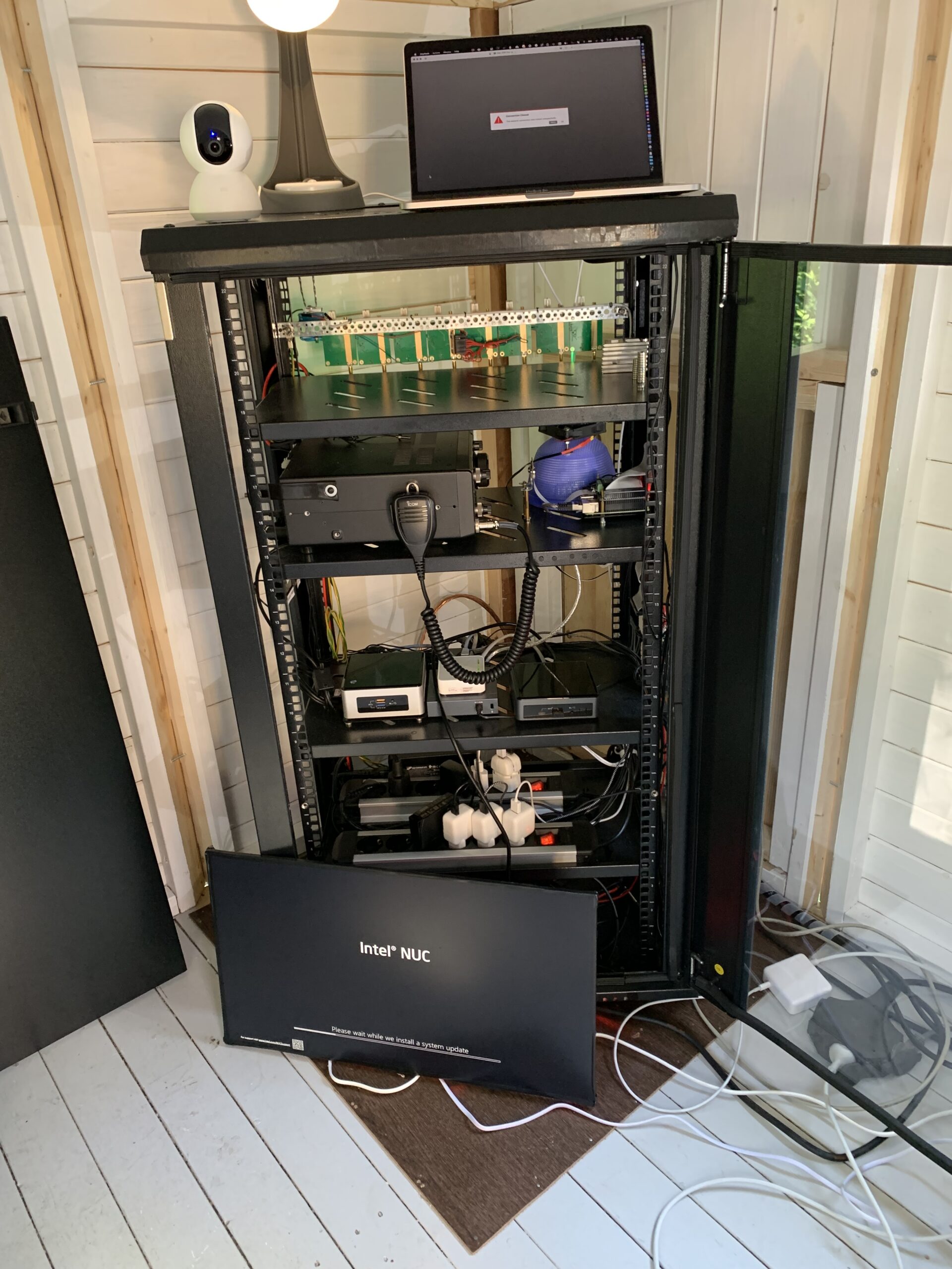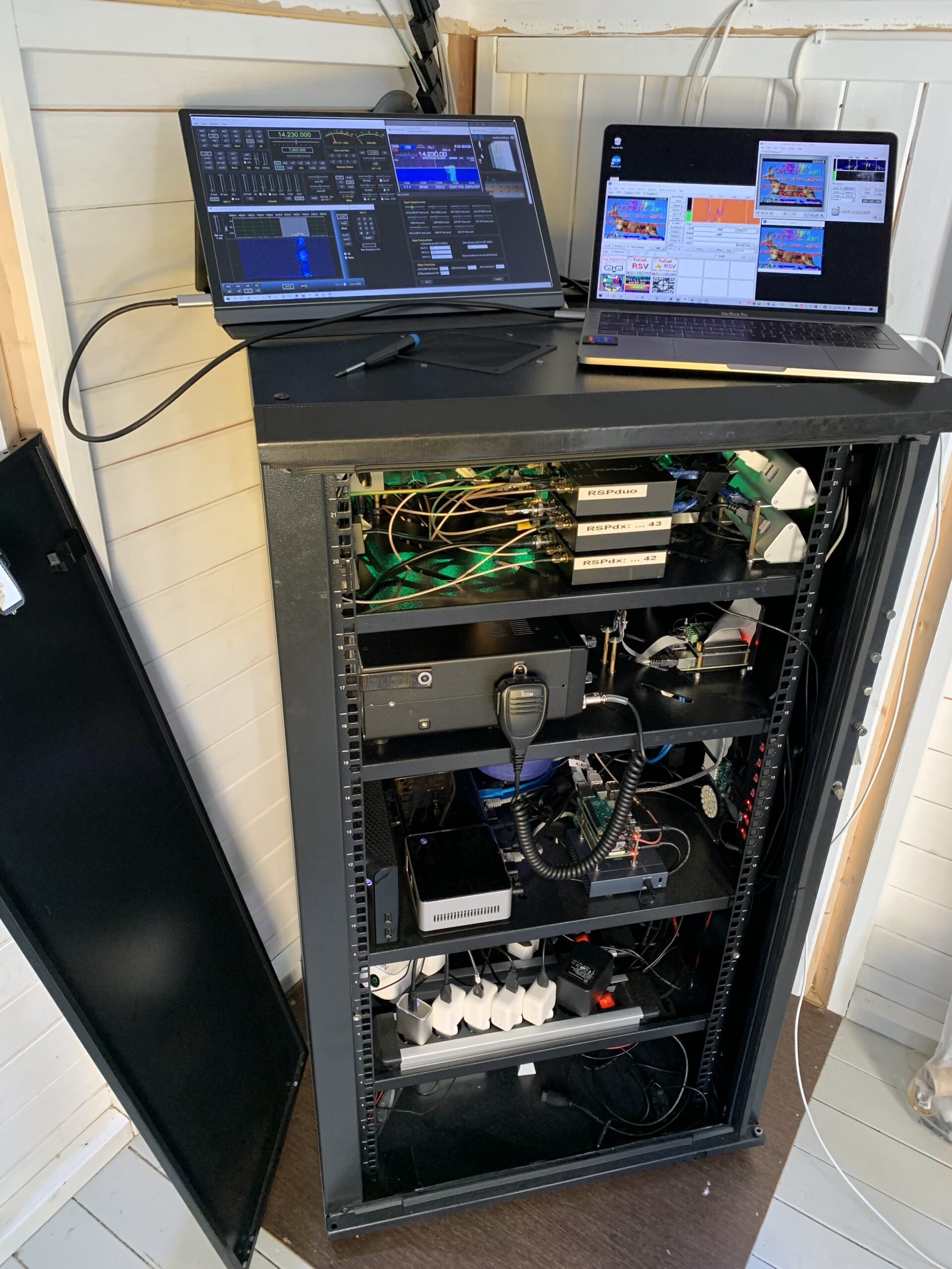Radio-cabin has also remote controlled security camera installed inside, mainly used for just maintenance and checking led's and other lights computers have. Icom has it's own high resolution camera pointing directly to it's screen so that I can see a real time stream of the actual display of the Icom in case the remote controlling software has some problems to display data.