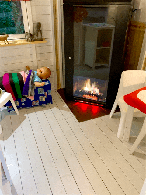 First came the playhouse. Luckily for us, a family of acquaintances were at the same time trying get rid of a playhouse, perfect! The cabin was awesome, only some minor adjustments were necessary to get room for the "fireplace".