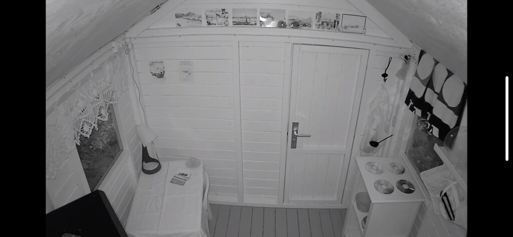 Final step, The Security. As the playhouse has quite expencive equipment installed and only some plexiglass windows and thin wooden walls protecting them it was important to have some security installed. The cabin itself has several RuuviTag sensor measurin all the movement of the cabin. The sensors are so sensitive that if some one walks near the cabin the sensors can measure it. The tremors that opening the door of the playhouse or some one trying to open the Radio-cabin by force causes, triggers audible alarm played by one of the computers installed in to the Radio-cabin. Also a email alert is sent to my email address. There is also another security camera that records any movement with audio, so if some one tries to steal something he/she will be recorded with HD resolution and sound. Camera is also equipped with two way intercom, so I can speak to whome ever there is at that moment next to it. The camera and it's internet connection are also battery powered so even if the main power is down there is power in these security features for several hours.