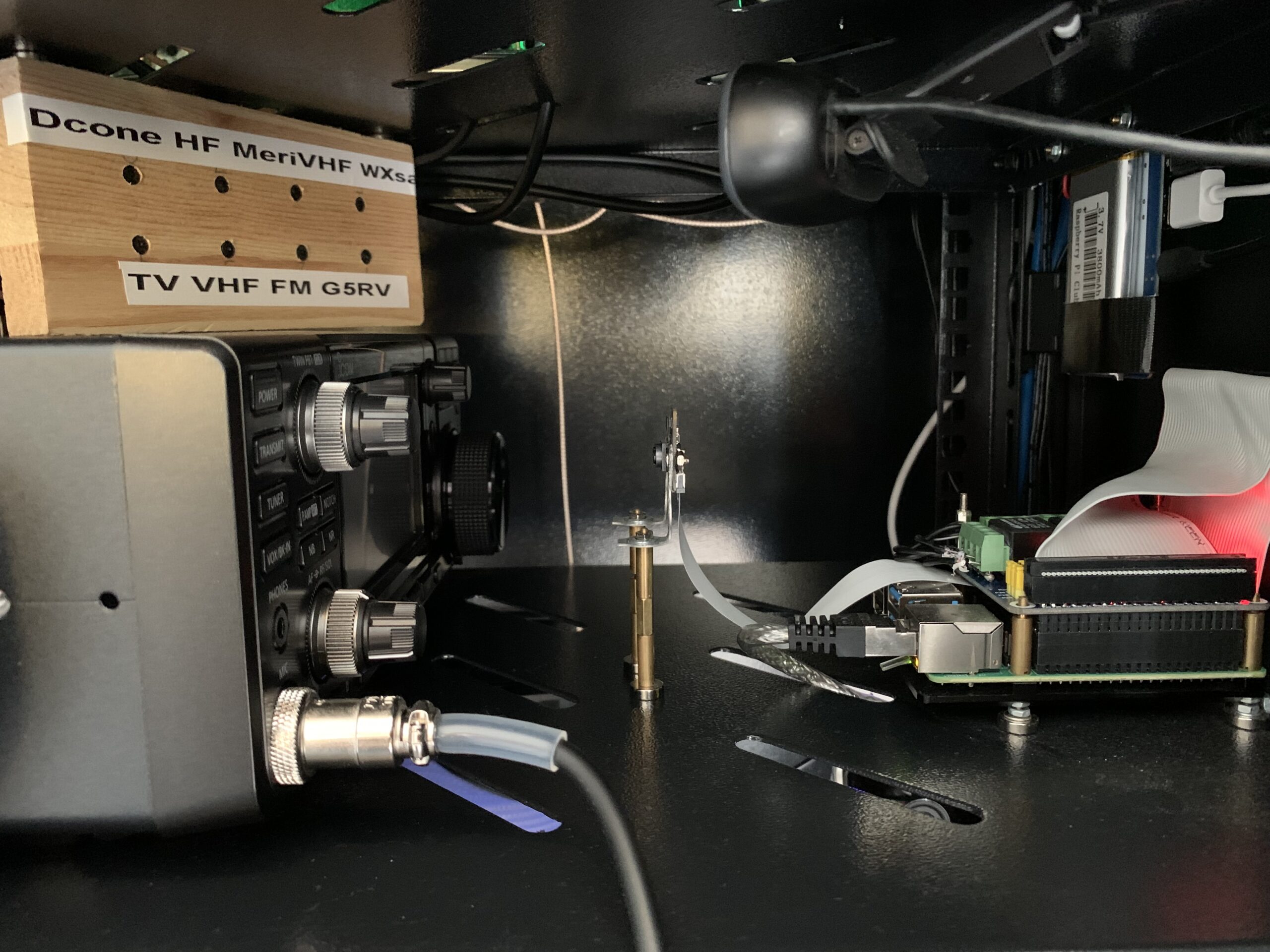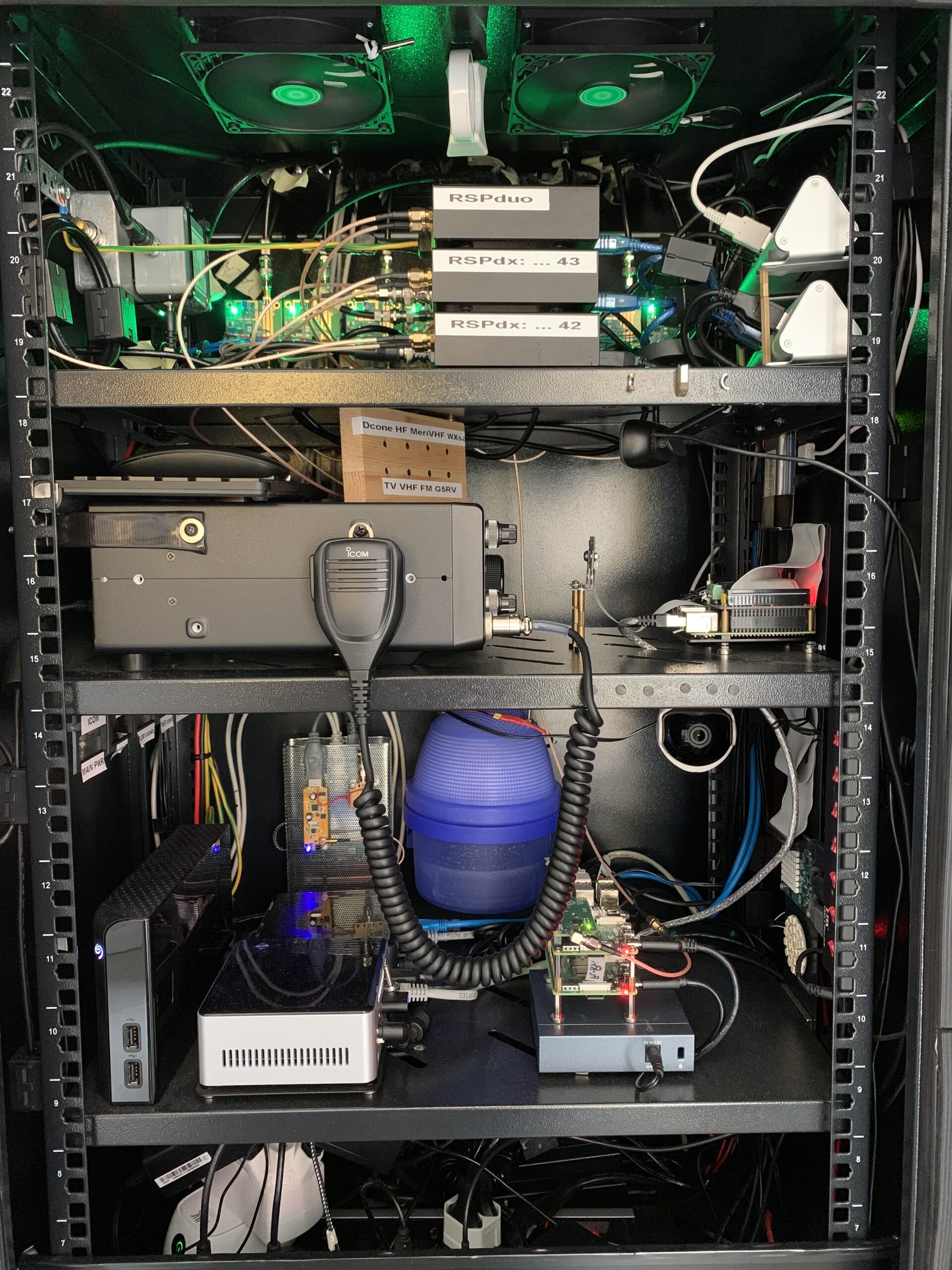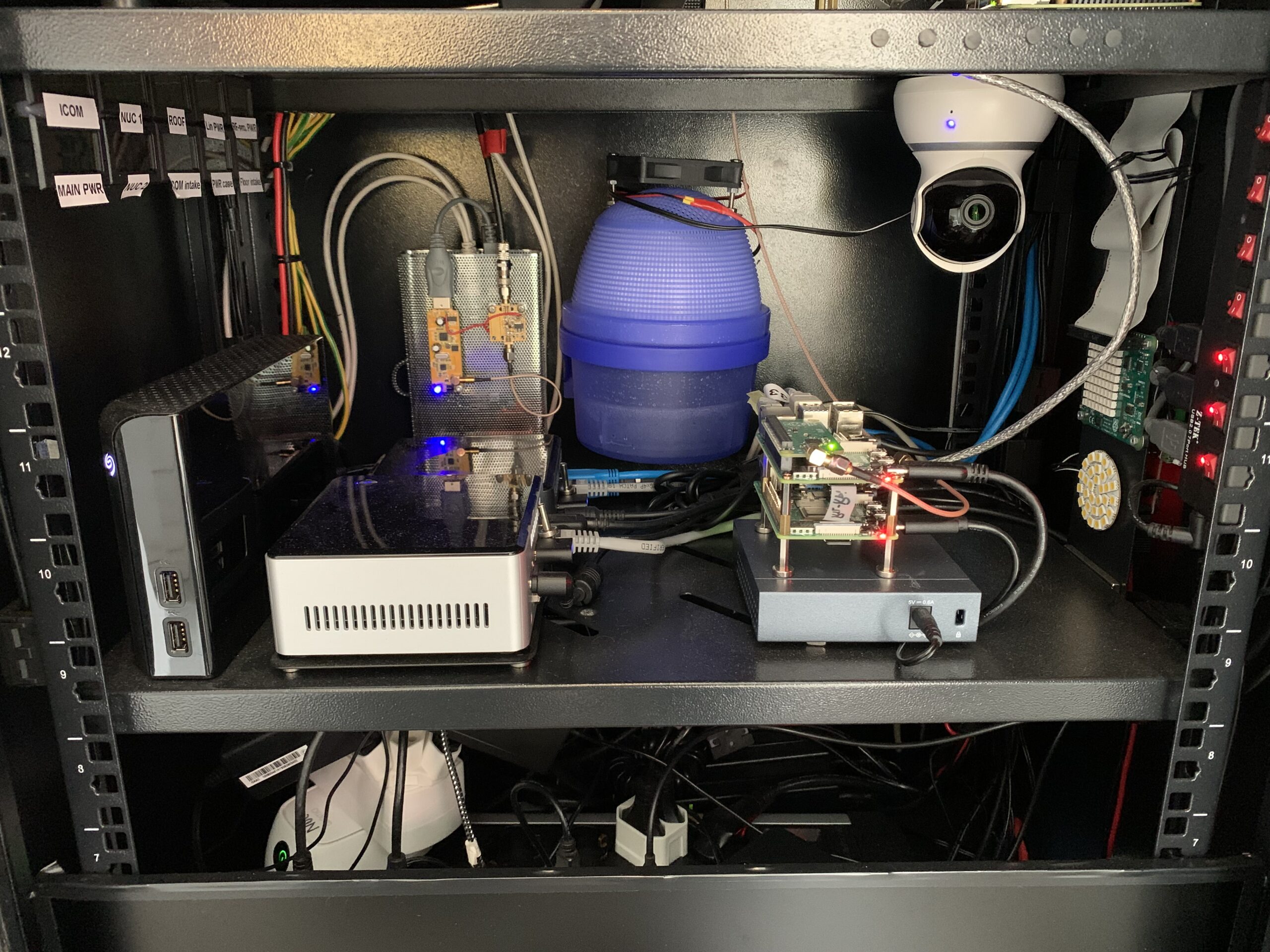 Temperature and humidity control. As there are several devices creating a lot of warm air I installed remote and thermostate controlled fans to the bottom of the Radio-cabin and also to the roof of it. Three Ruuvi-Tag sensors measure the temperature and humidity inside the Radio-cabin and in case of too warm, too cold or too humid values inside the cabin the fans are started. Floor fans circulate the air inside the Radio-cabin to level the temperature, if that is not enough the roof fans are started and will push hot air out from the Radio-cabin. Fresh cold air is sucked via floor vent (filtered). There is also humidity collector bucket (that blue one) that keeps the overal humidity in control. It uses a special chemical compound that 'melts' slowly from solid to liquid by absorbing humidity from the air. It has a small fan installed to the top of it to speed up the air circulation (can be remotely controlled on or off).