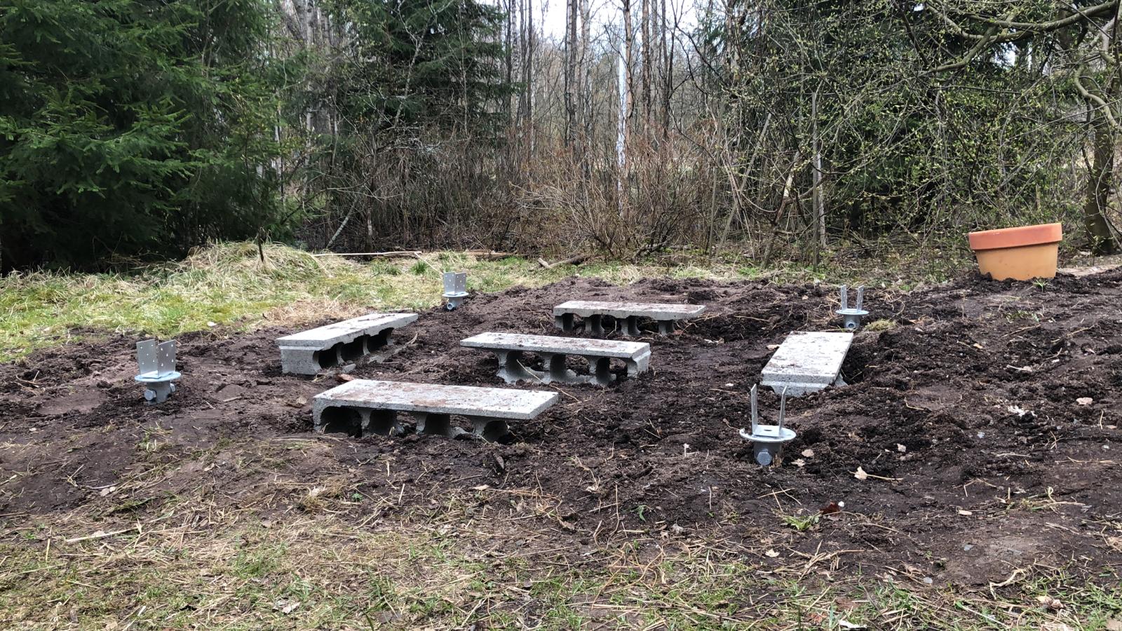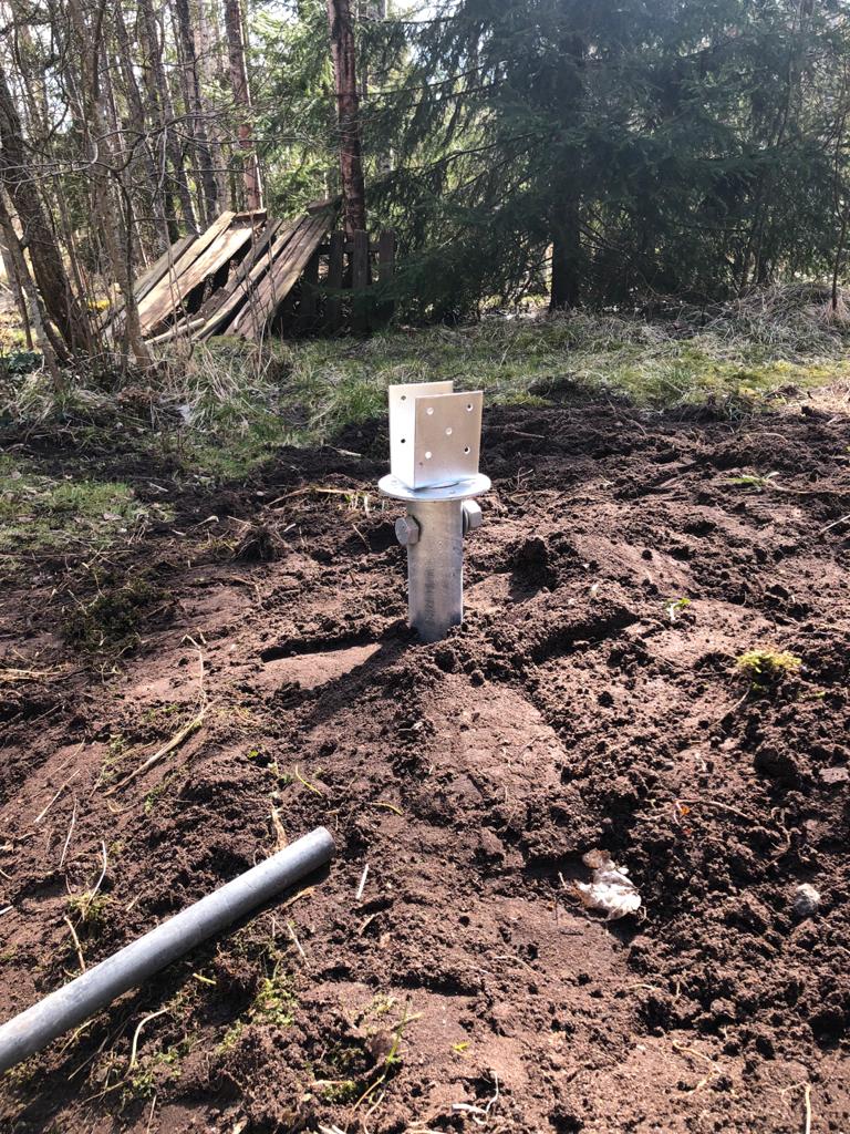 As it was clear that everything needs to be grounded well, we decided to mount the cabin using steel poles. These steel poles would go down 1,6 meters into the soil so they are perfect grounding points for the system. Also we decided to have a small patio and garden for my nephews and nieces to play with.