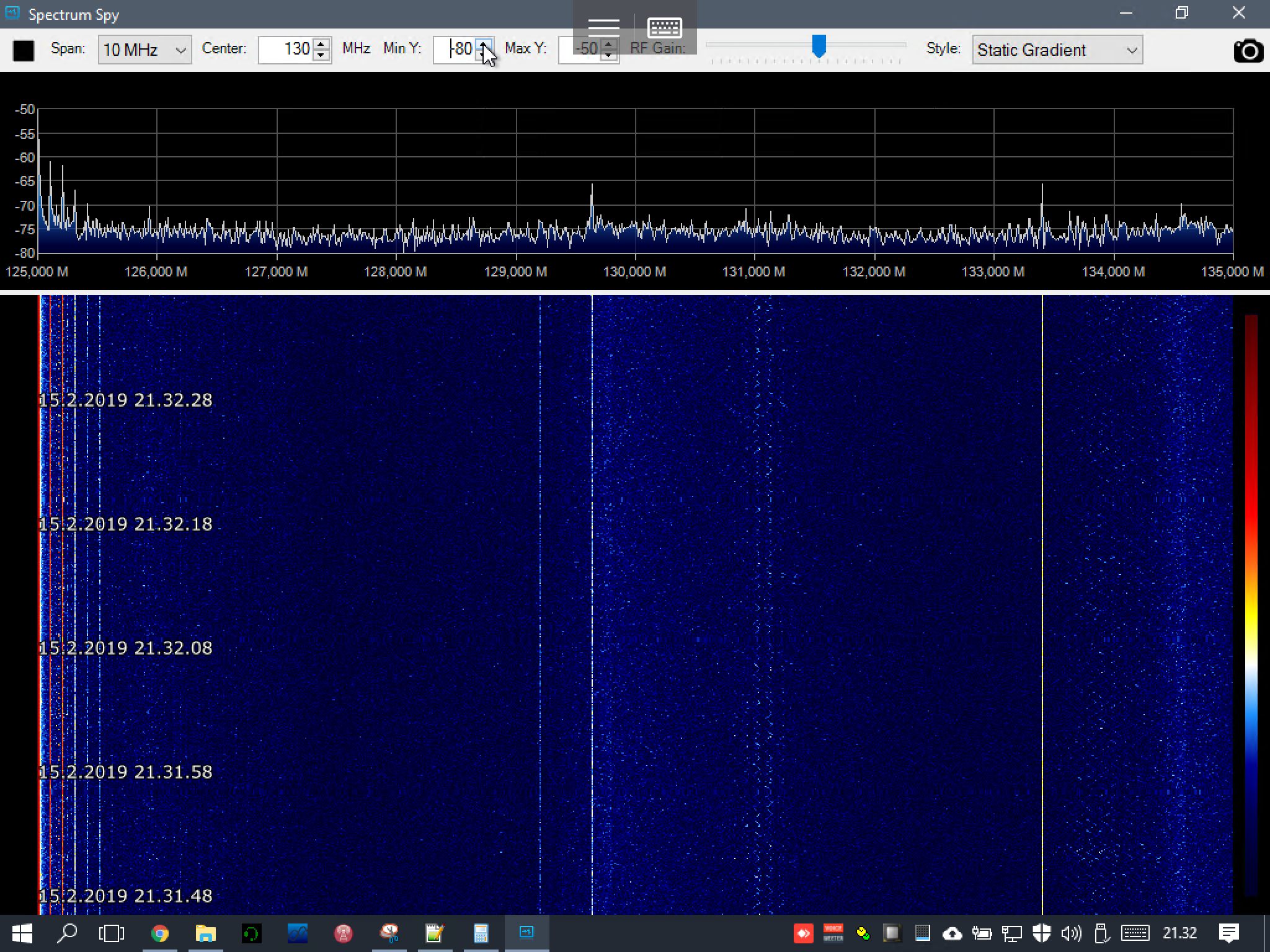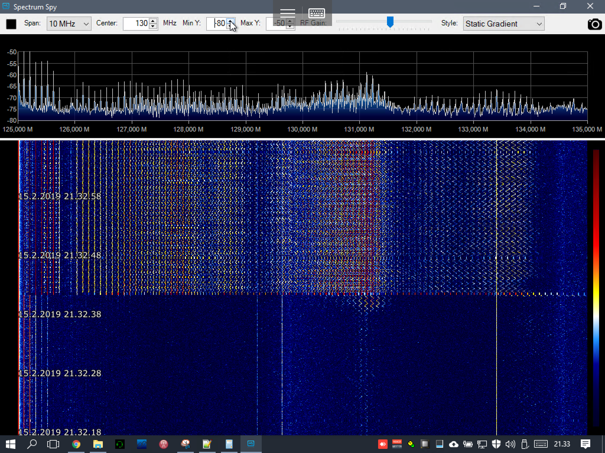 The software I used for measuring was SpectrumSpy, really simple yet powerful small software that comes with SDR# that can be used to monitor large block of spectrum at once. It only draws the waterfall, so no sound is extracted from the radio.