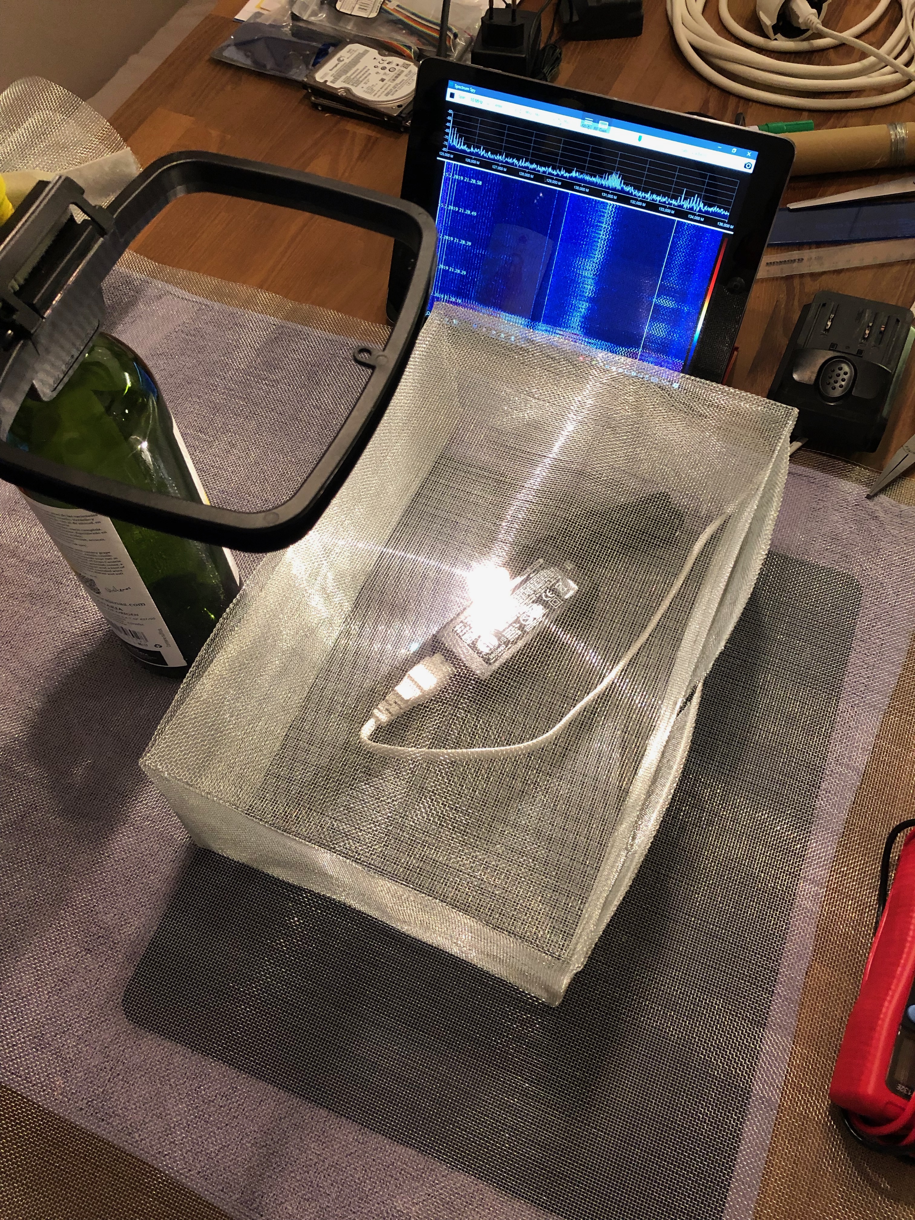 I covered a table with the metal mesh, then used empty wine bottle as an support for small loop-antenna. The antenna was connected via DownConverter to AirSpy Mini so that I can see what happens down there in HF (VLF) range.