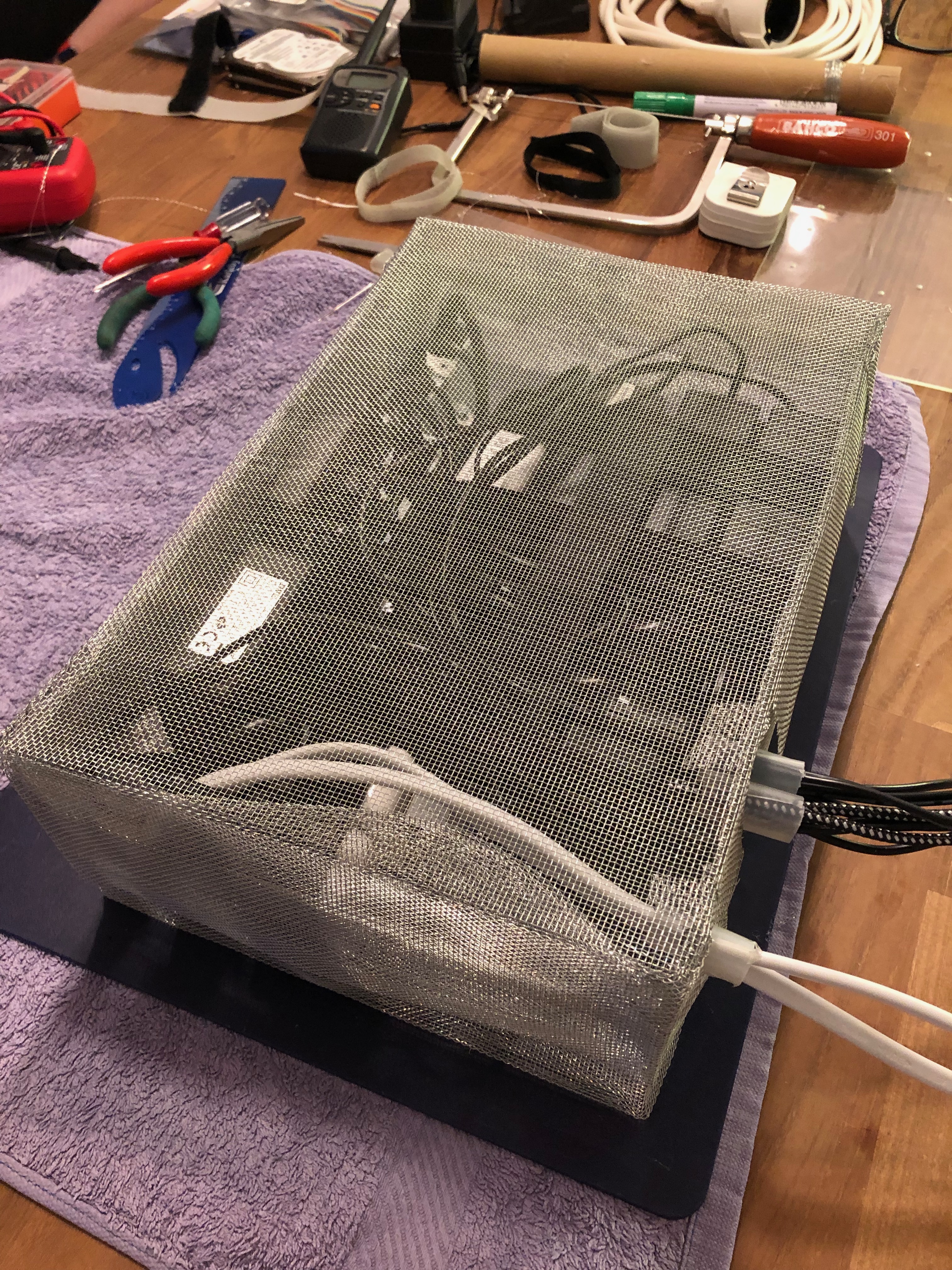 After few hours (and very painful finger mutilation - oh those spikes!) I had a test "box" that I could use to test if this kind of shield is enough to isolate most of the HF interference these switched-mode power adapter causes.